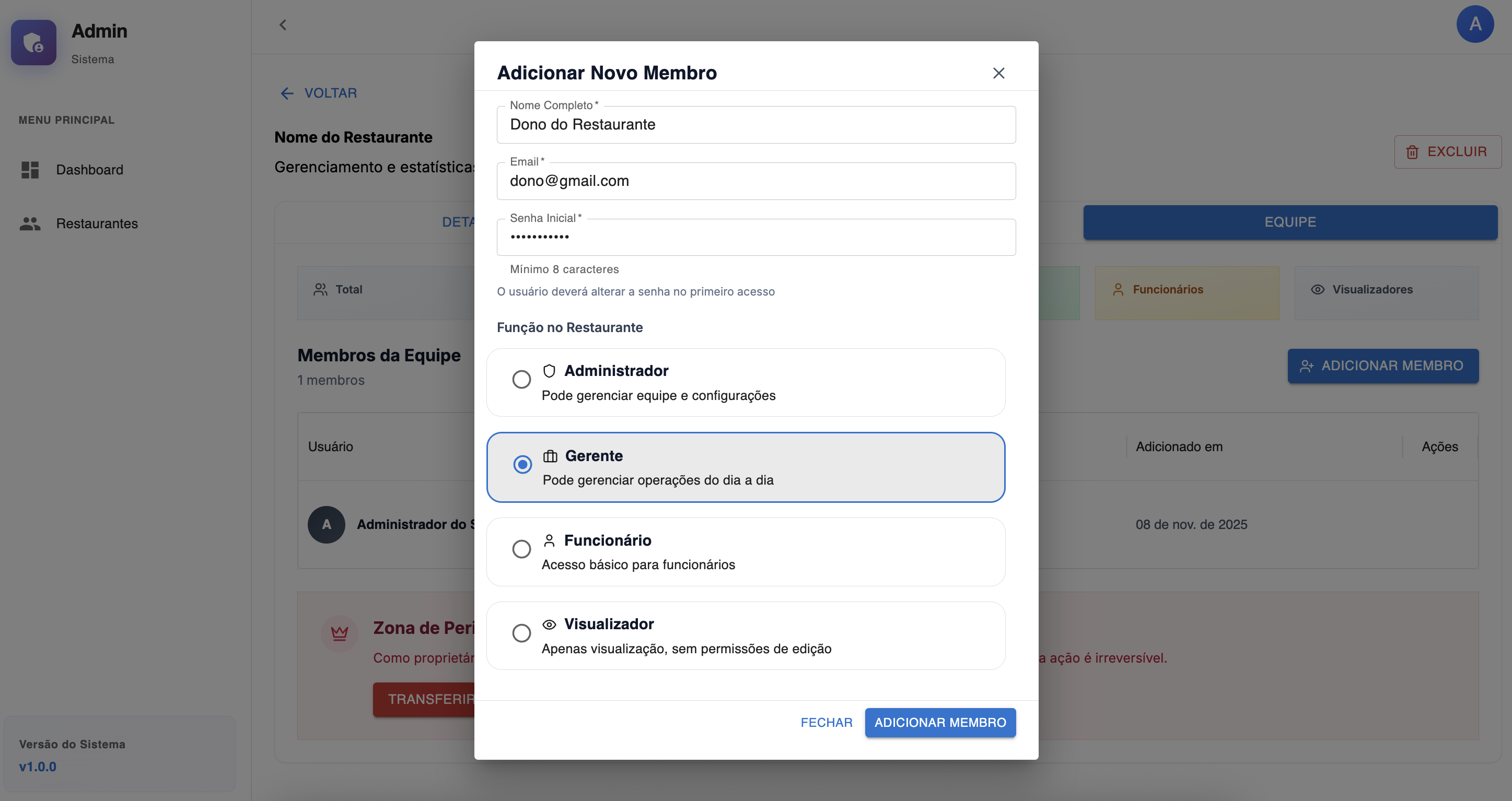 - Na página do restaurante, clique em 'Equipe', em seguida 'Adicionar Membro' para abrir o modal de associação.